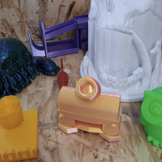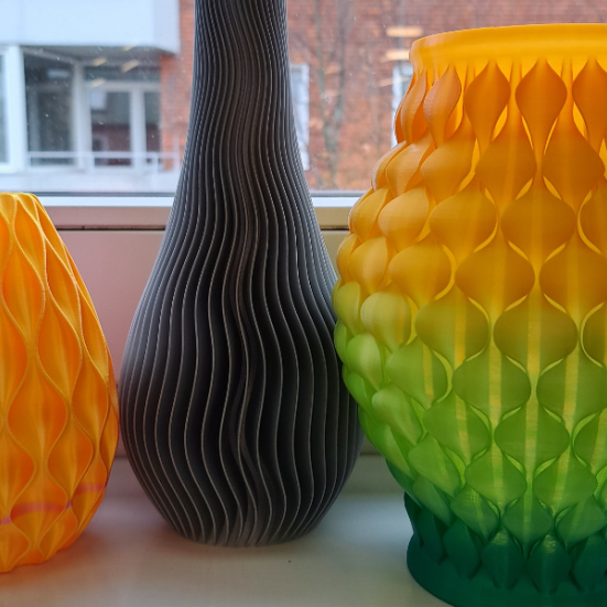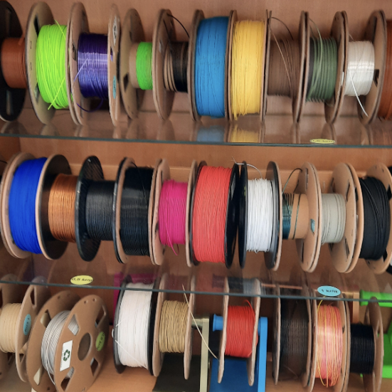 Vi printer i PLA og PETG, som er plasttyper velegnede til både funktionelle og dekorative projekter. Materialet kaldes filament og fås i mange farver og egenskaber.